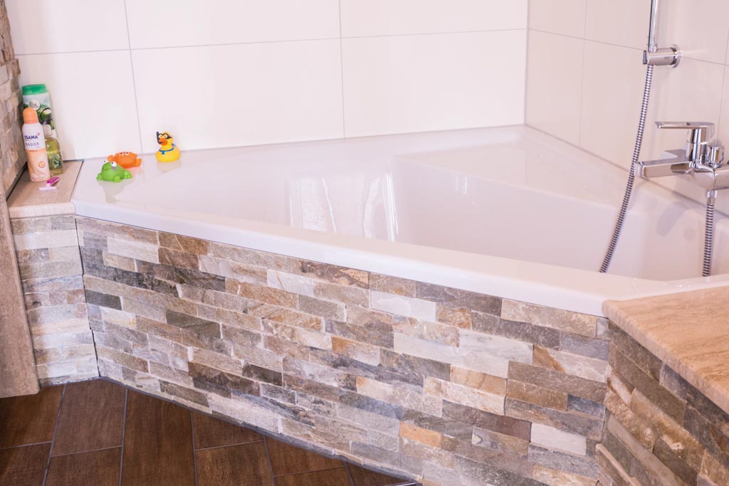 Küche mit Unterbaubecken mit Naturstein-Verblender und Riemchen
