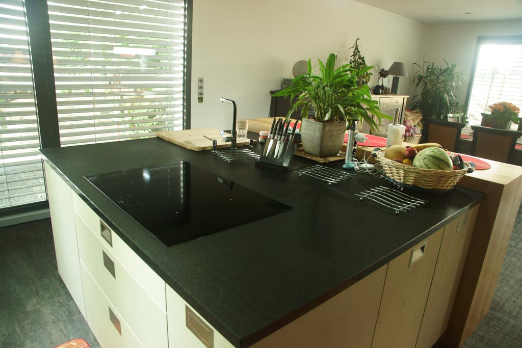 Eine tolle Küchenarbeitsplatte aus Quarzit in satinierter Oberfläche mit flächenbündigem Kochfeld und flächenbündiger Spüle